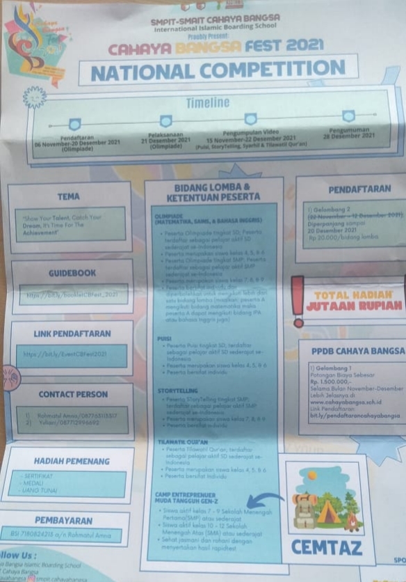 #CBFest2021 #cahayabangsaIIBS #Cahayabangsa #lombanasional #lombaspeech #lombastorytelling #lombaSD #lombaSMP #lombanasional #lombagratis #lombaspeech #lombatilawah #lombasyarhilquran #olimpiadeMTK #olimpiadeenglish #olimpiadeIPA #olimpiadenasional #lombabacapuisi #olimpiadebahasainggris #osisCahayaBangasa